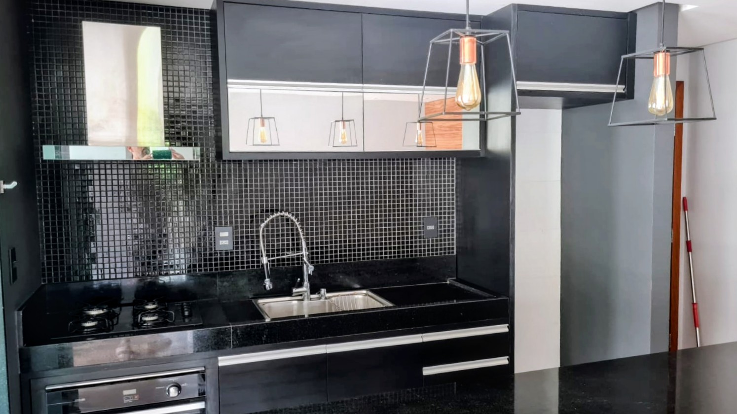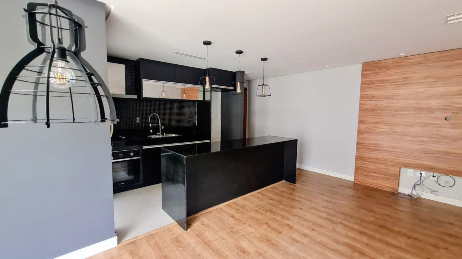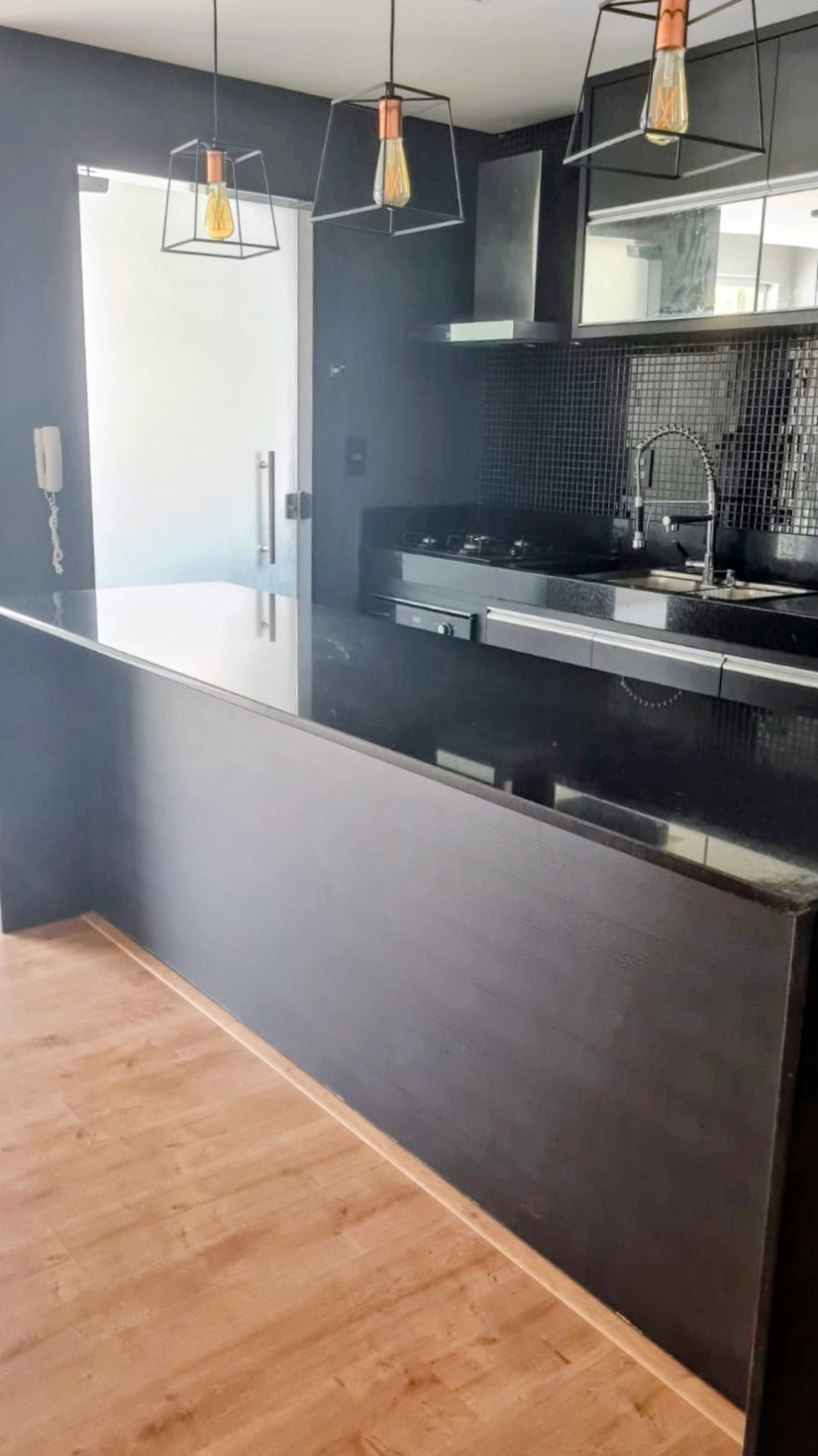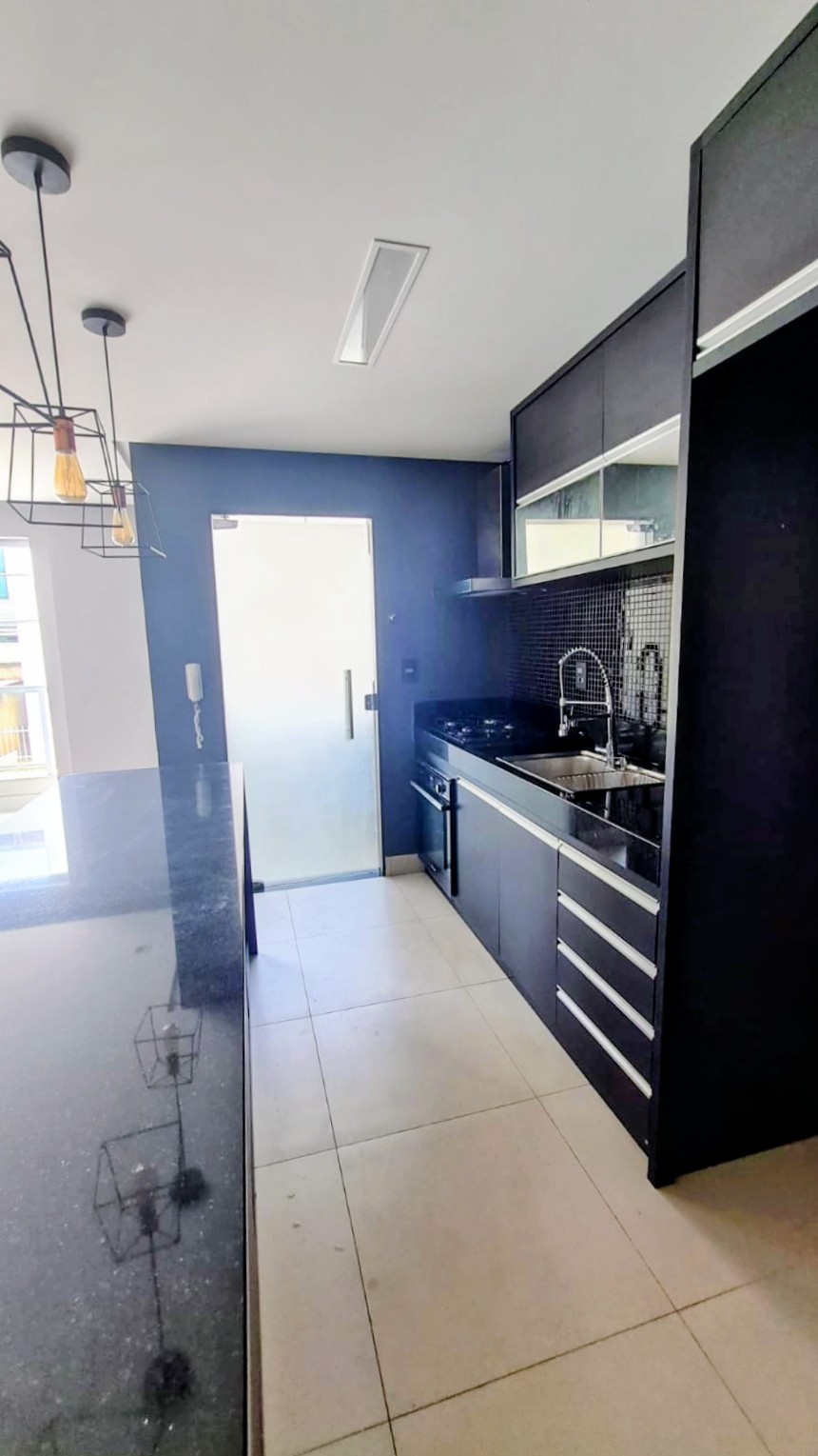 - Sala ampla com sacada, conjugada com Cozinha Americana com Balcão em Granito;